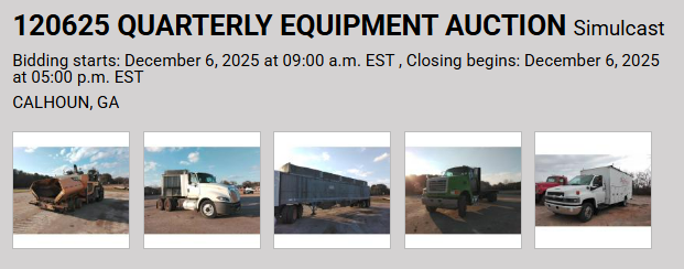 Equipment Auction Saturday, December 6, 9 AM Quarterly Equipment Auction Construction Equipment, Truck Tractors, Tractor Trailers, Construction Support, Farm Tractors, Farm Support, Automobiles, Trailers, Recreational 2270 Rome Rd SW, Calhoun, GA 10% BUYER PREMIUM ON SITE, 12% BUYER PREMIUM ONLINE 12/06/25 LIVE AUCTION CATALOG 12/07/25 – 12/10/25 ONLINE ONLY AUCTION CATALOG Get financed with Currency!!